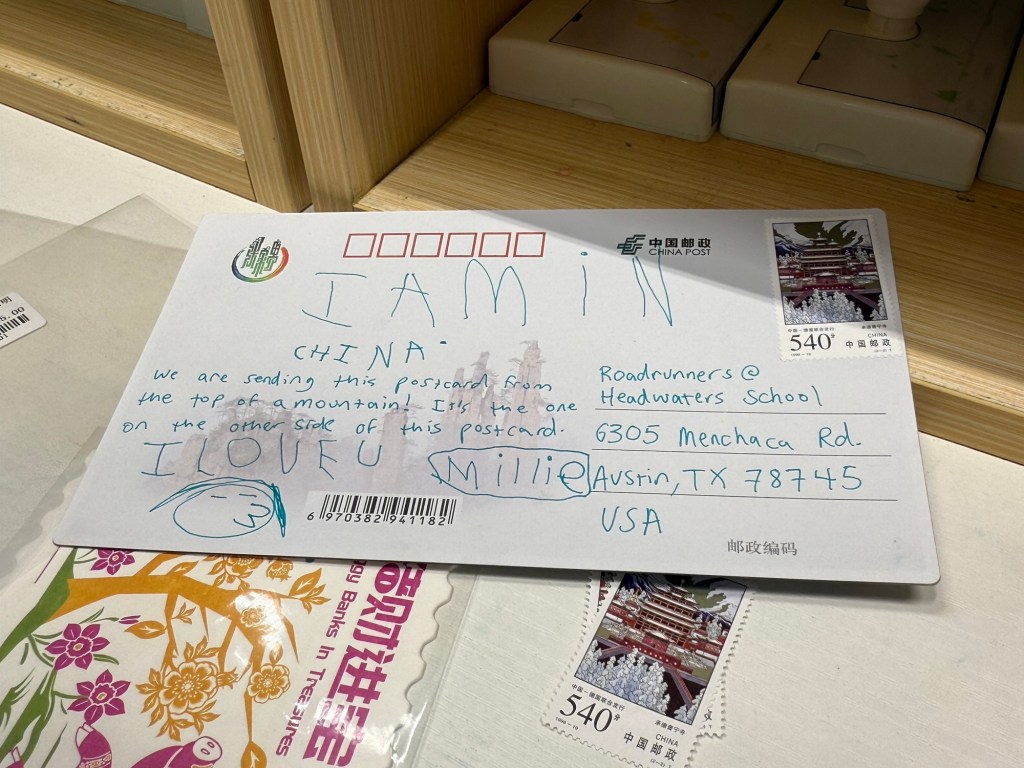 We leaned into the dreariness and got some hot cocoa at the top. There was a postcard writing store which helped us kill 30 minutes. She wrote one to her old class and some friends.