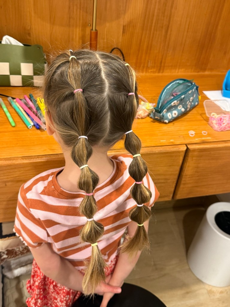 We woke up still feeling full of all our carbs and meat, so we skipped breakfast. Even Millie just ate an apple and then didn’t seem hungry for much else. I gave her some very fancy hair. Never thought I’d be a mom who does hair like this, but I really enjoy it.