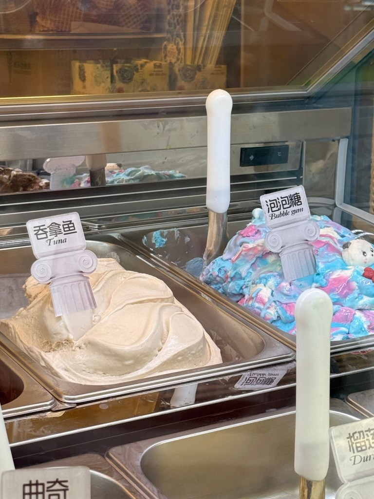 After this we walked along the Yu Garden food road. We stopped at a gelato place for ice cream Friday and noticed they had tuna ice cream. We assumed it was a bad translation of something else so we requested a sample to figure it out. Nope, it was in fact fishy tuna ice cream. It was as awful as it sounds, maybe even worse.