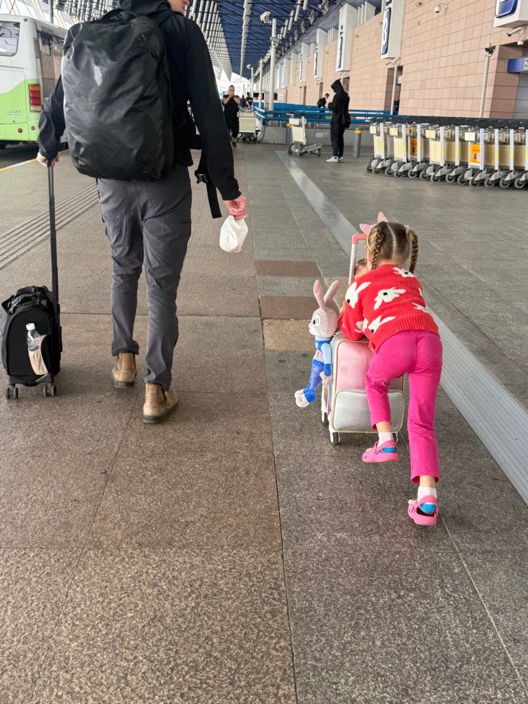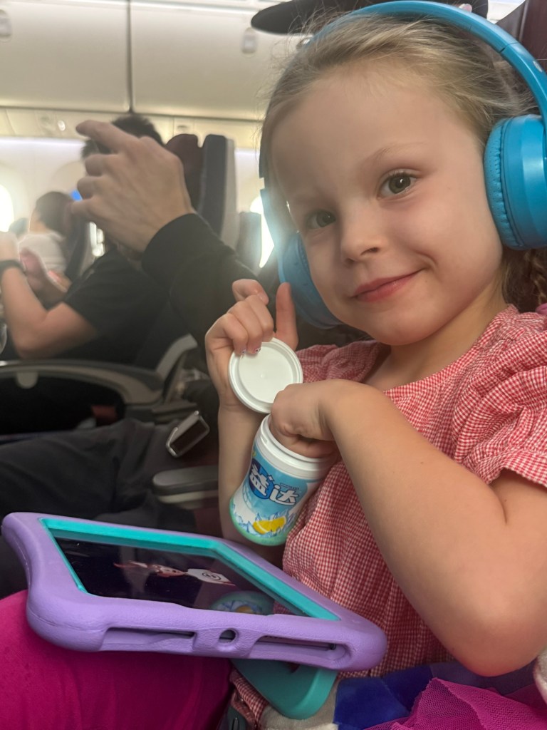 The drive to the airport was a hellish 1 hour. Our driver accelerated the car by “pumping” the gas pedal. This is not great in a normal car. It’s especially egregious in an electric car, where the acceleration and deceleration are much more intense. He did this for the full hour even though we were on a smooth road without traffic. Millie started feeling queasy about 15 minutes in. Somehow Nick, family genius, thought to stash an air sickness bag in her backpack months ago. We drove for about 10 minutes holding it up for her like a feed bag until she spewed. We caught it all and eventually got to the airport. She was a great sport despite how bad the ride was.
