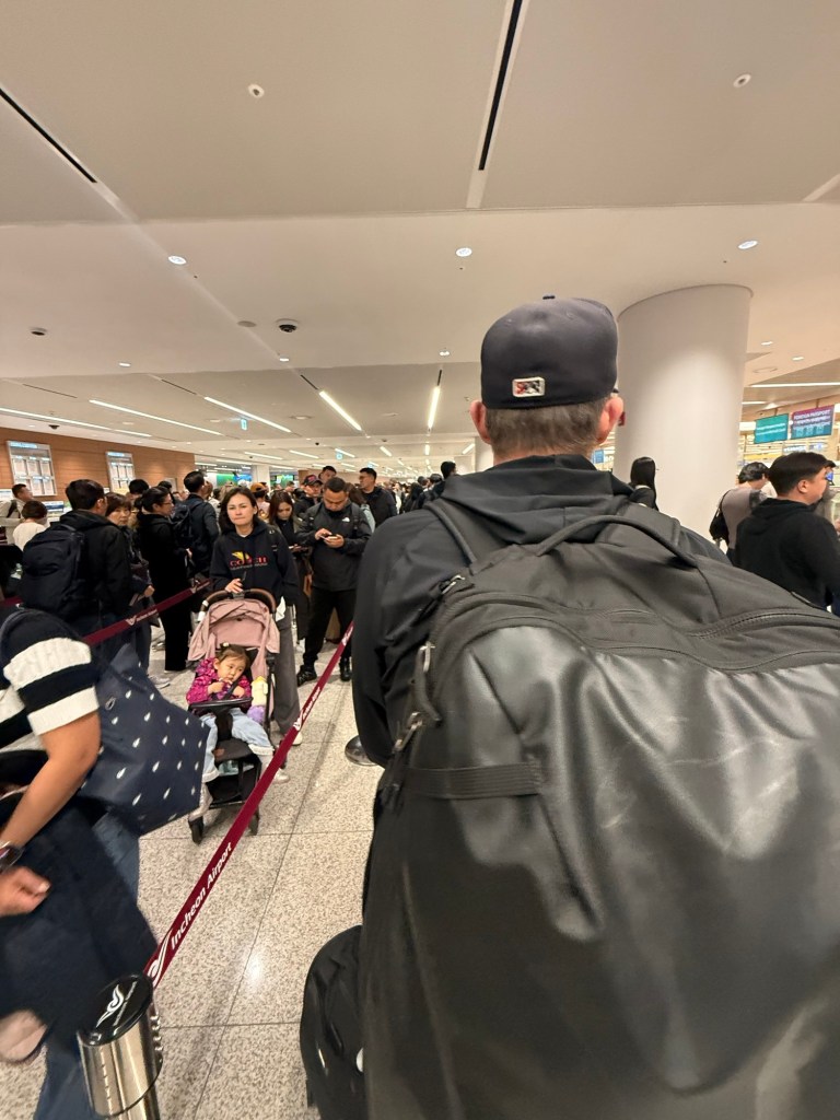 We landed and then had to wait a very long time in a packed passport control line. Millie did great. I think we all have some PTSD from prior outbursts while in a confined space like this.