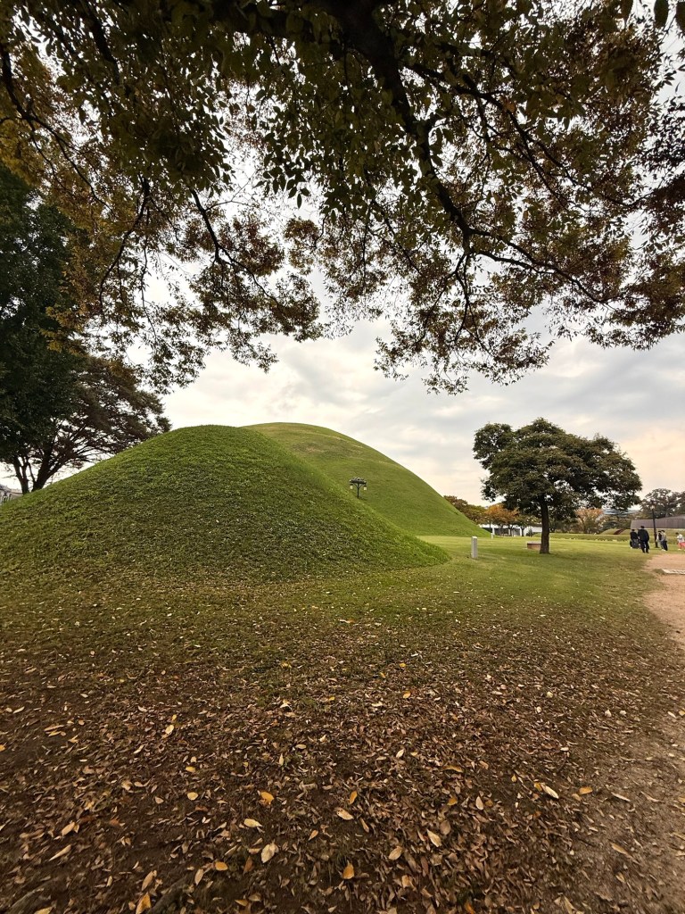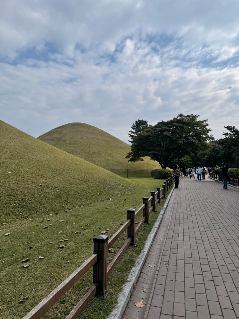 After the hotel buffet we walked just a few blocks to the mounds that pop up through central Gyeongju. Each of these is a burial mound, and somehow look very natural and very unnatural at the same time. People had lived among them and didn’t realize they were man made until a man dug into one in the 20s. I’m not sure how you could see these and think “yep, just a hill”.