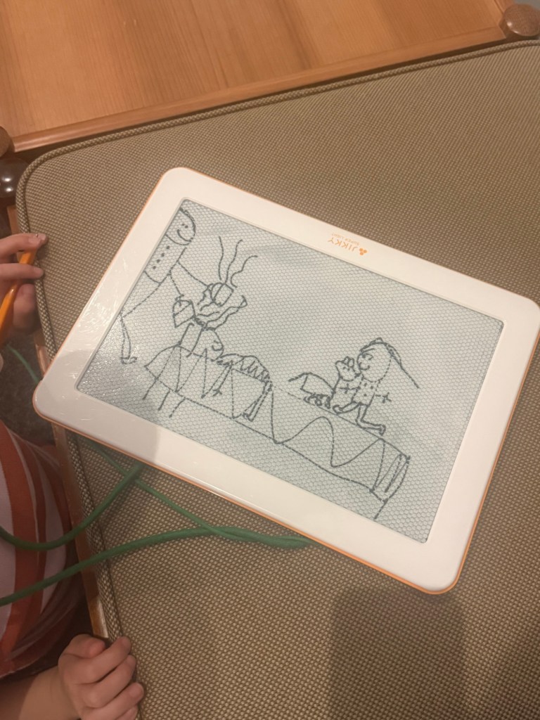 Millie passed the time with a drawing pad they had for kids. She was happy as a clam.