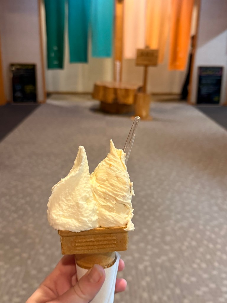 The onsen had a cafe and served homemade ice cream with local dairy. We couldn’t not get one. I called it “secret ice cream” because I knew Millie could never know about it. She’d get too jealous. Future Millie – when you read this – I owe you an ice cream cone.