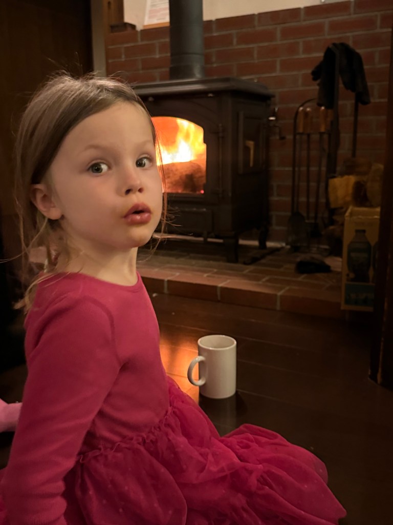 Nick lit another roaring fire. Millie got her hot cocoa she couldn’t finish yesterday, and then did some drawing with my dad.
