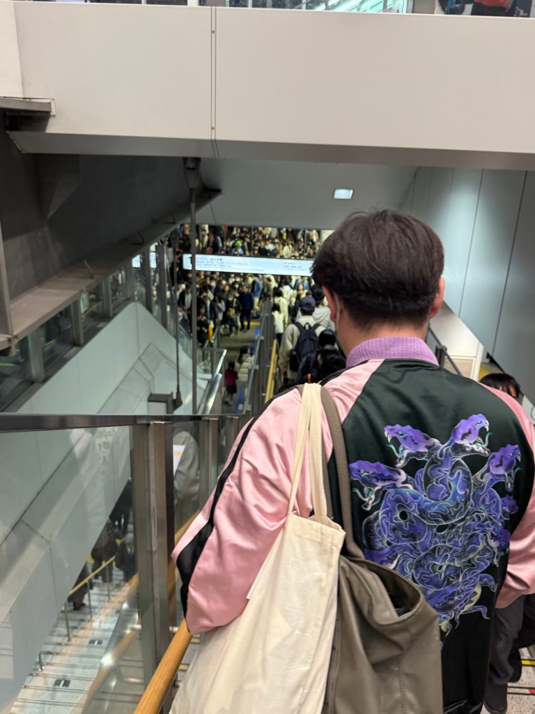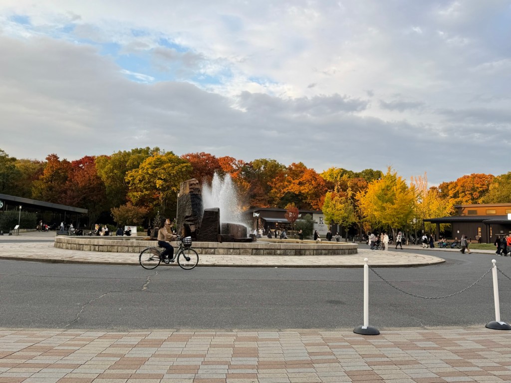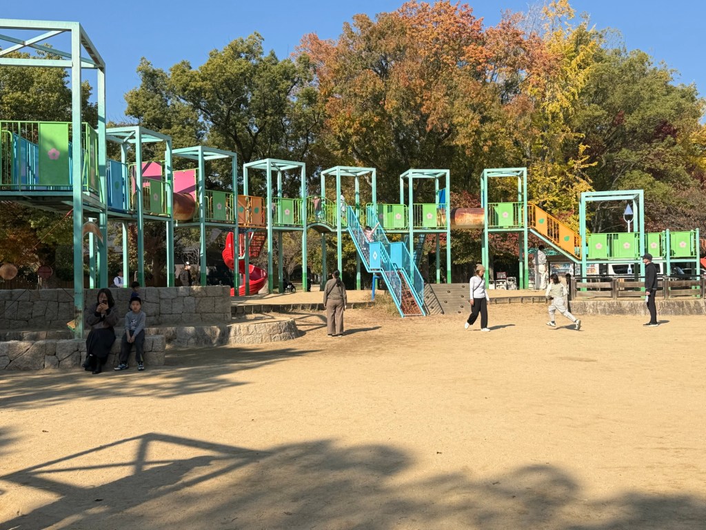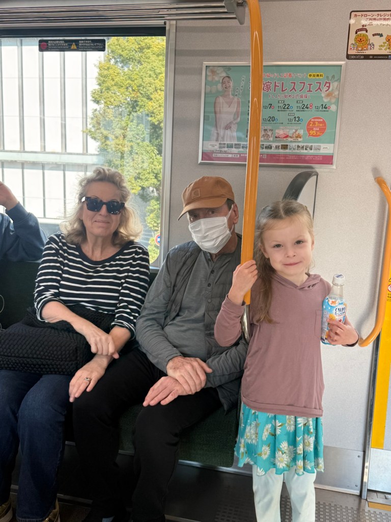 We started our day by taking the train to Osaka Castle Park. I realized last night that I’ve failed at taking many photos of my parents, and especially of people together, so here is one of them on the train. My dad is fitting in with Japanese society as “man getting over a sickness”.