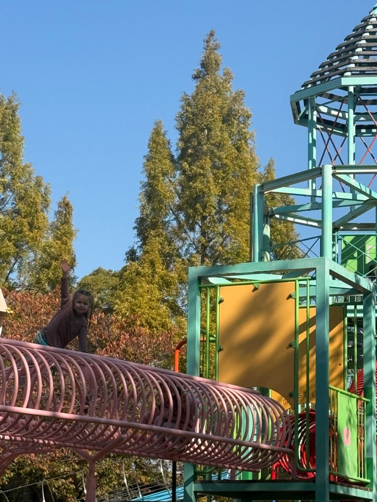 She didn’t last too long and complained that the metal hurt her knees. From her dangerously high perch in the above photo, she spotted another playground and request we go to it. This is how we found Playville, where she then spent the majority of her day.