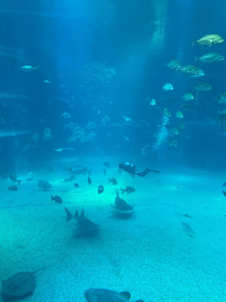 The highlight was the giant central tank with whale sharks and shark sharks. The most exciting moment was when a duo of divers came in and scooped out a dead fish!