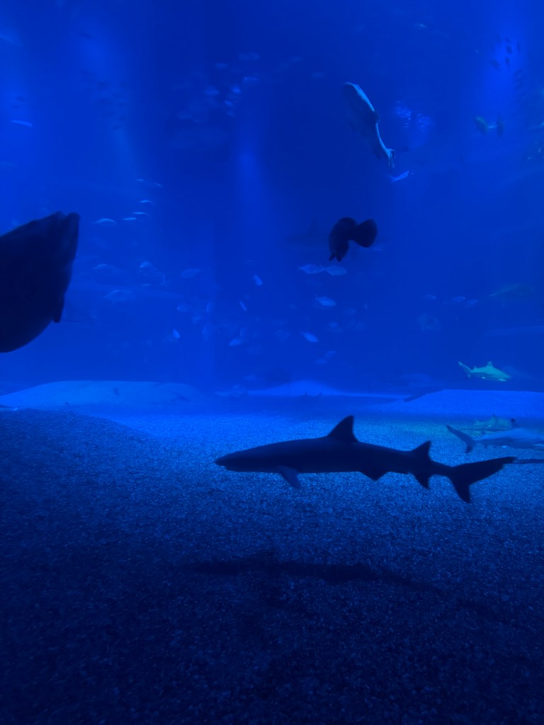 Once the sun was down we went back through to see the night time tanks. The aquarium changes the lighting to mimic nighttime. We sat on a bench by the big one for a while just watching everything swim around.
