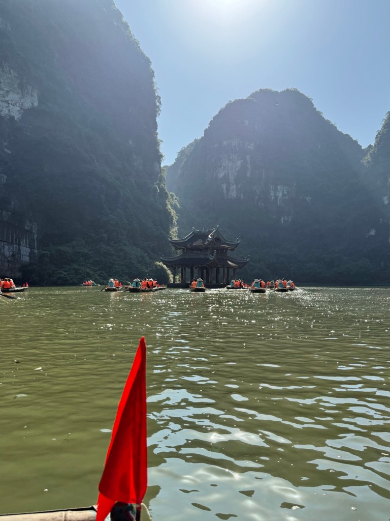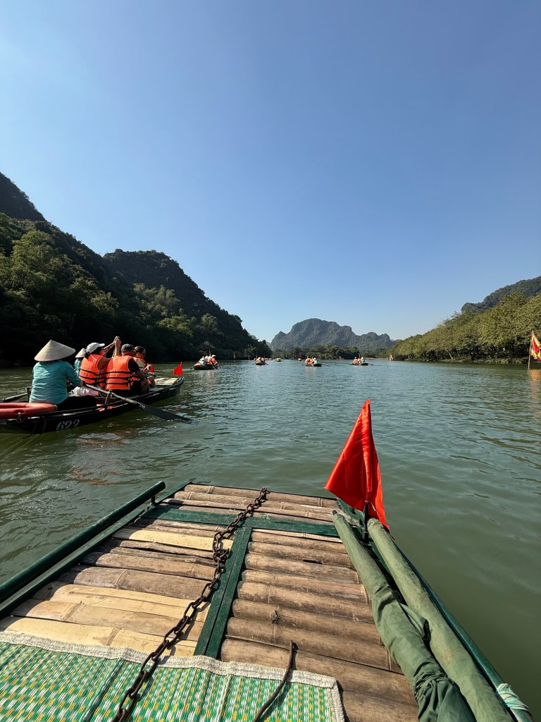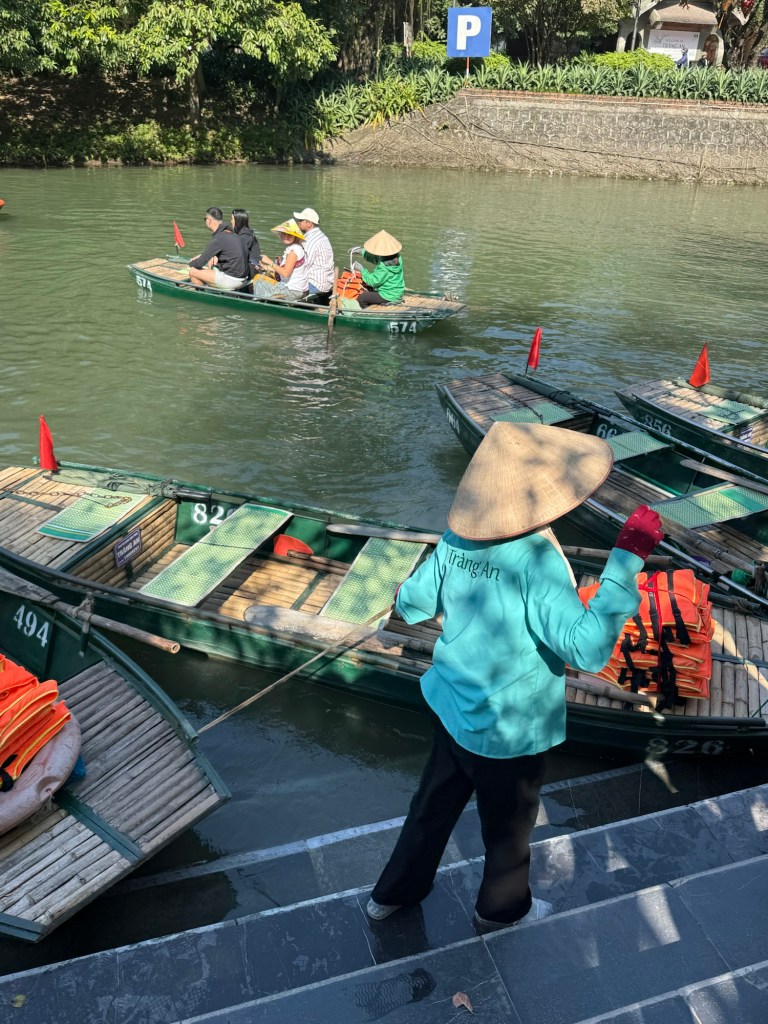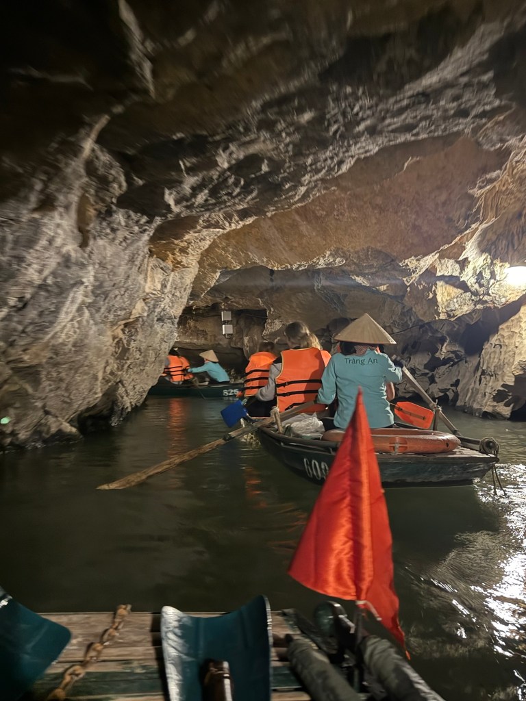After this we had a mediocre buffet lunch and then got back into the bus for our next stop, boating around Trang An. Each boat was rowed for two hours by small but mighty women. I can’t imagine a rougher job, especially in the heat of the summer. We helped paddle and agree that we’ll be sore from it tomorrow.