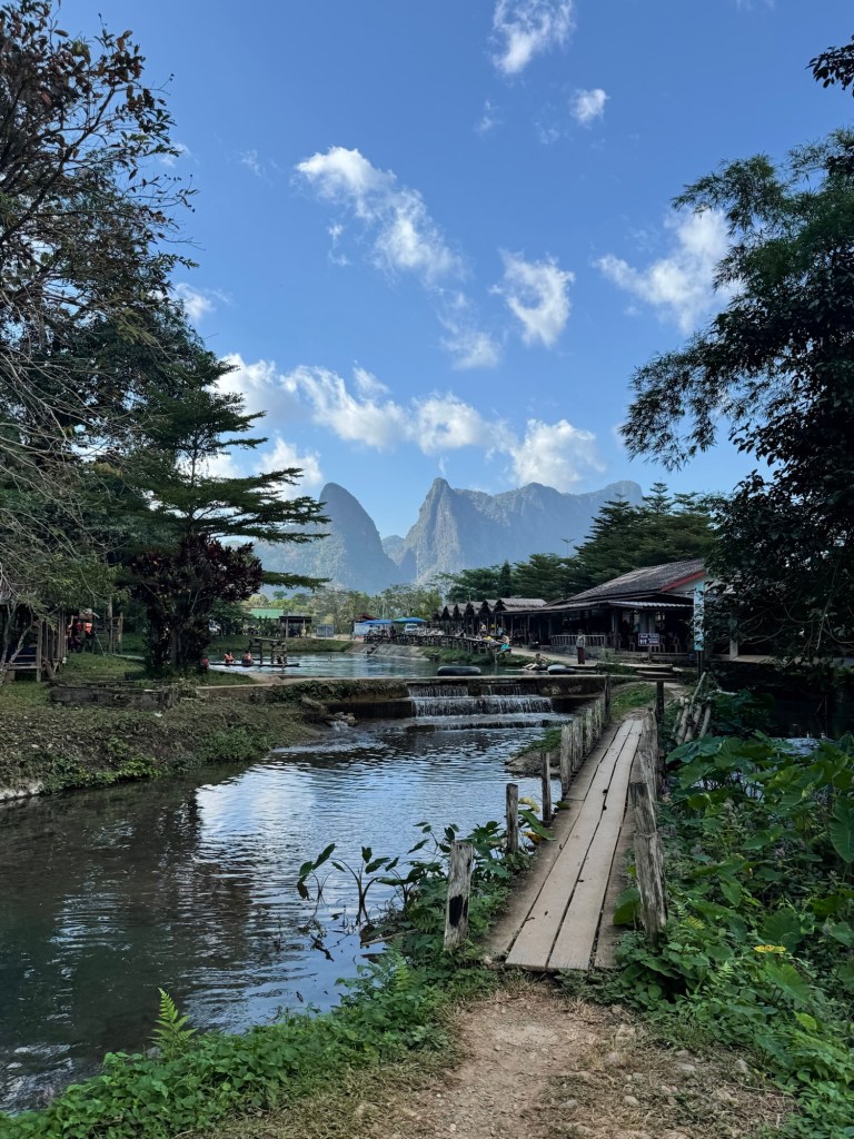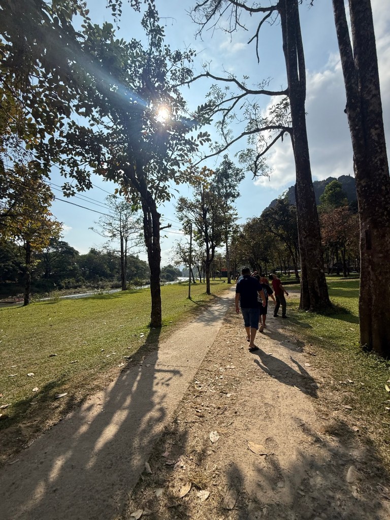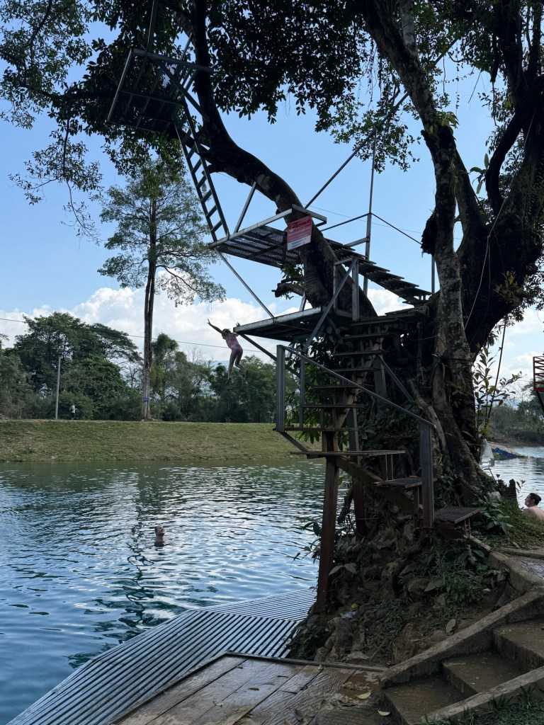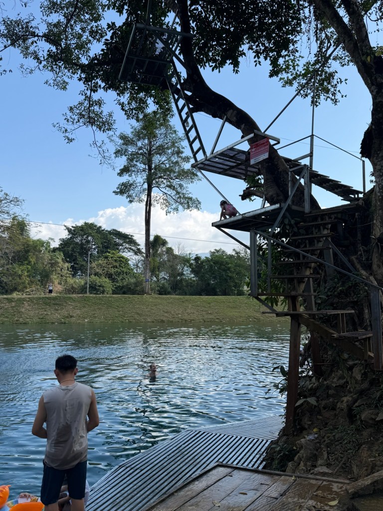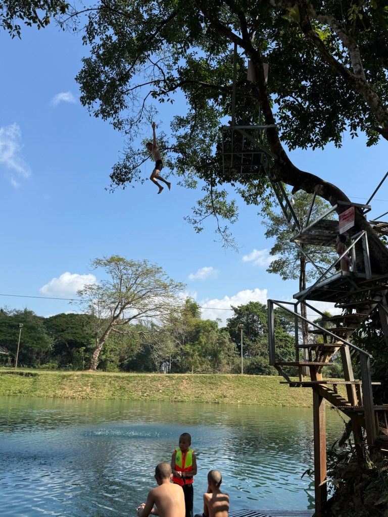 We woke up without any big plans for the day. Nick had read that Vang Vieng has a bunch of different caves and swimming holes, but there wasn’t one “must visit” one. After breakfast we asked the hotel reception what they’d recommend. They first pointed us to Tham Chang because it was a 10 minute walk down the road, and they recommended Blue Lagoon 3 since it was less busy than some of the others. This was enough for us to make it our plan for the day.