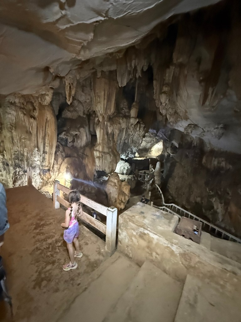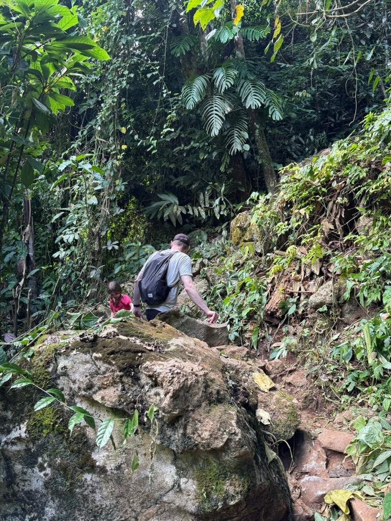 We put on our dry clothes and followed a trail into yet another cave. This one was less maintained and didn’t have the helpful concrete stairs up to it. We turned around when it felt too risky for a little kid.