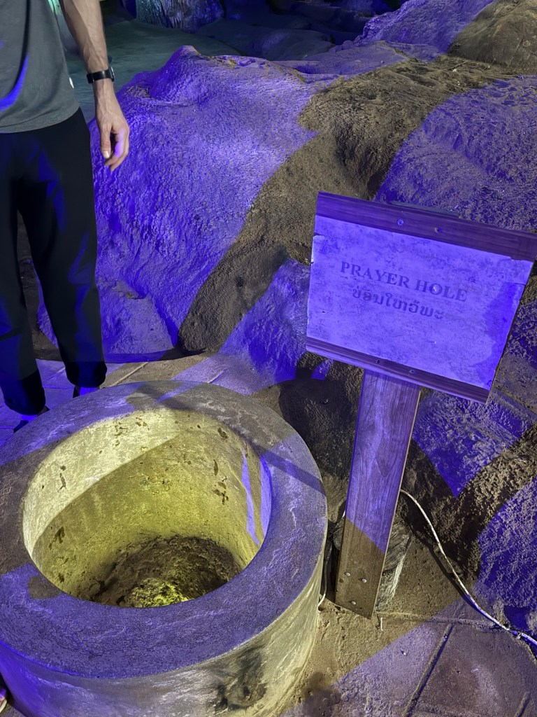 We walked the short distance down the dirt road to the entrance of Tham Chang. This immediately reminded me of a Texas swimming hole. They had a big parking lot, tubes for rent, and families having picnics. Before jumping in the water we spent some time exploring to see what was there. We walked up a tall and exhausting staircase and into the cave that sat behind the cliffs above the swimming hole.