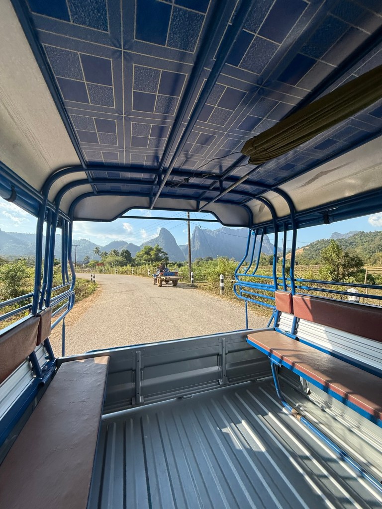 We rode in the back of the bumpy tuk tuk for about 30 minutes through the Lao countryside, stopping occasionally for cows in the road.