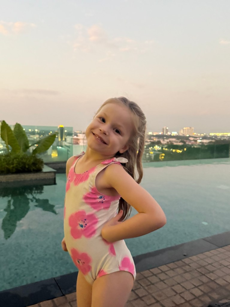 Millie begged to swim in the apartment pool which was on the roof and I brought her up there. She took this cute photo before deciding she didn’t want to get in. She saw people in the workout room and got very mad when I wouldn’t let her use the equipment. The flip side of all her maturity recently has been that she gets mad when she isn’t allowed to do adult things. We went back down to the apartment and got ready for an early bedtime. She was grumpy and a bit whiny all day, which I think is the result of a few late nights in a row.