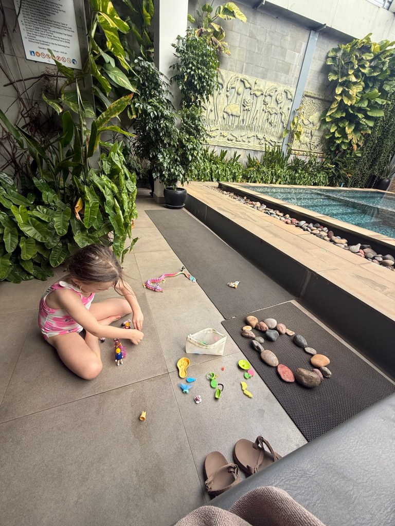 After breakfast we played in the room a bit and then went down to the pool. We swam together and she spent some time playing alone with her little playmobil people. These continue to be the most played with toy of the trip.