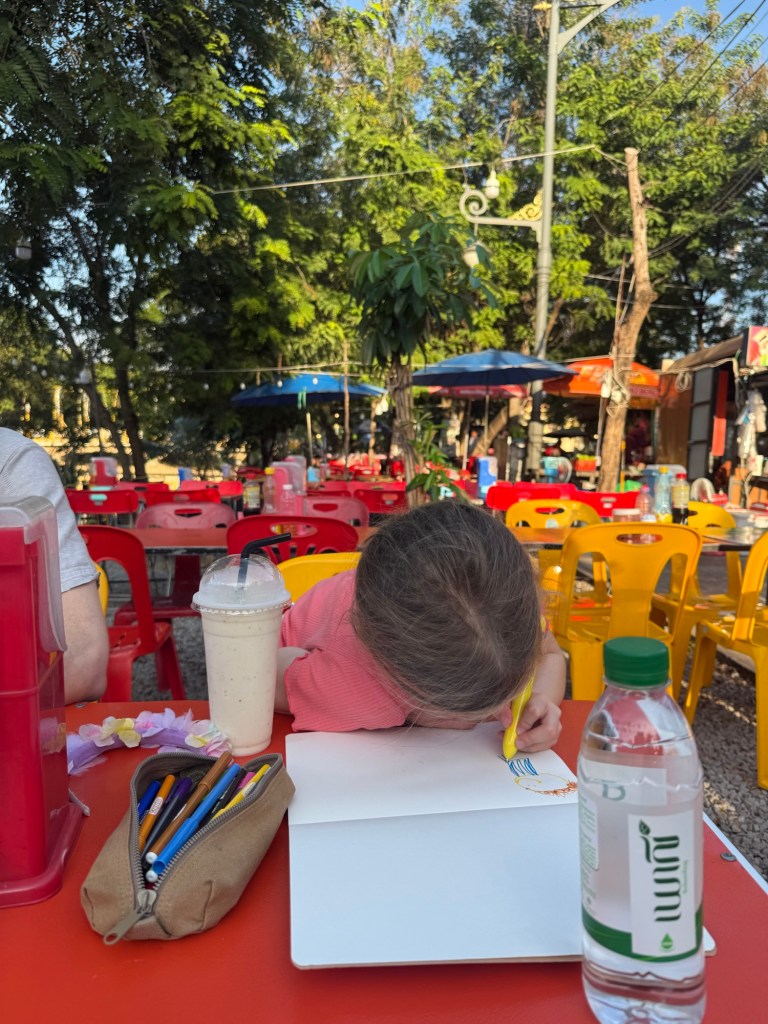 Nick spotted two people who had been on our visit to elephants, a very sweet grandfather / granddaughter duo from Michigan. They both did Peace Corps in Asia (60 years apart) and are back to visit together. He is 86 which amazed and impressed us. We spent a couple of hours catching up with them and getting to know them more. Millie and Kata hit it off and spent some time drawing. At the end, Millie asked “Can we hang out again? What’s your number?” I neglected to get a photo of all of us together.