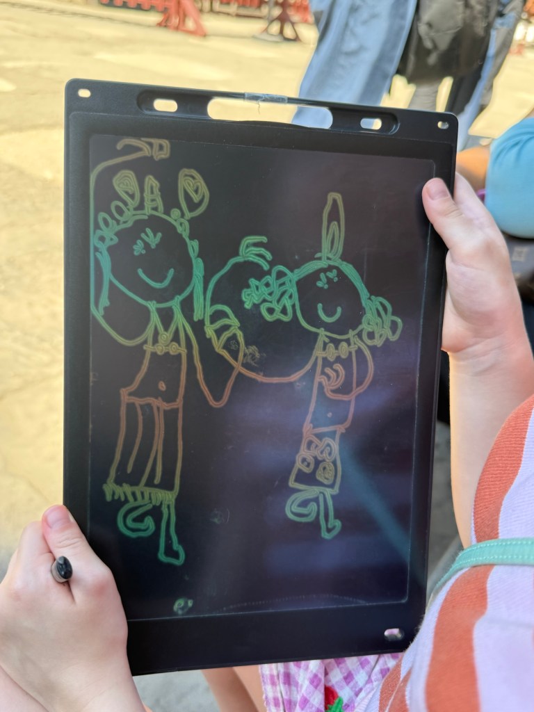 She drew on her drawing pad. We had just walked past some carvings and looked at them, and she drew them in her style from memory. As always, I was impressed.