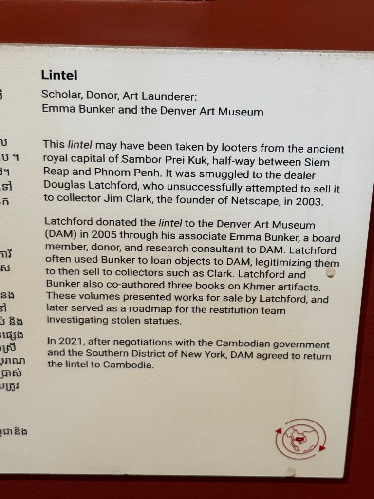 Much of the museum was dedicated to telling the story of how these pieces had been looted and smuggled across the world, and the heroic story for how Cambodia got them back. “Scholar, Donor, Art Launderer” made me laugh on this sign. So much (well-deserved) shade.