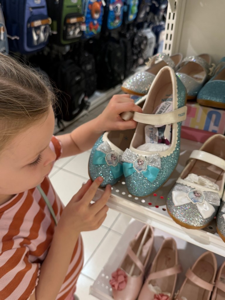 She was very, very excited. We brought her to the giant shoe area and she honed in on a specific pair of Elsa shoes. Unfortunately they didn’t have them in her size. She was disappointed but chose a second pair. Same thing. She chose a third pair, same thing. She was disappointed. We were disappointed.
