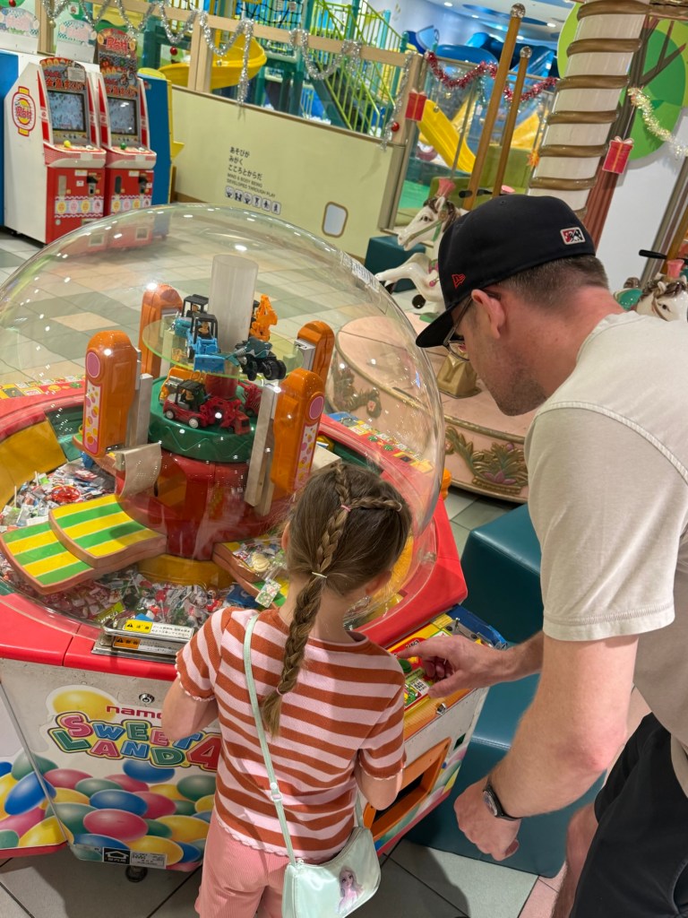 We distracted her away from the shoes and a full mental breakdown by allowing her to play an arcade game.