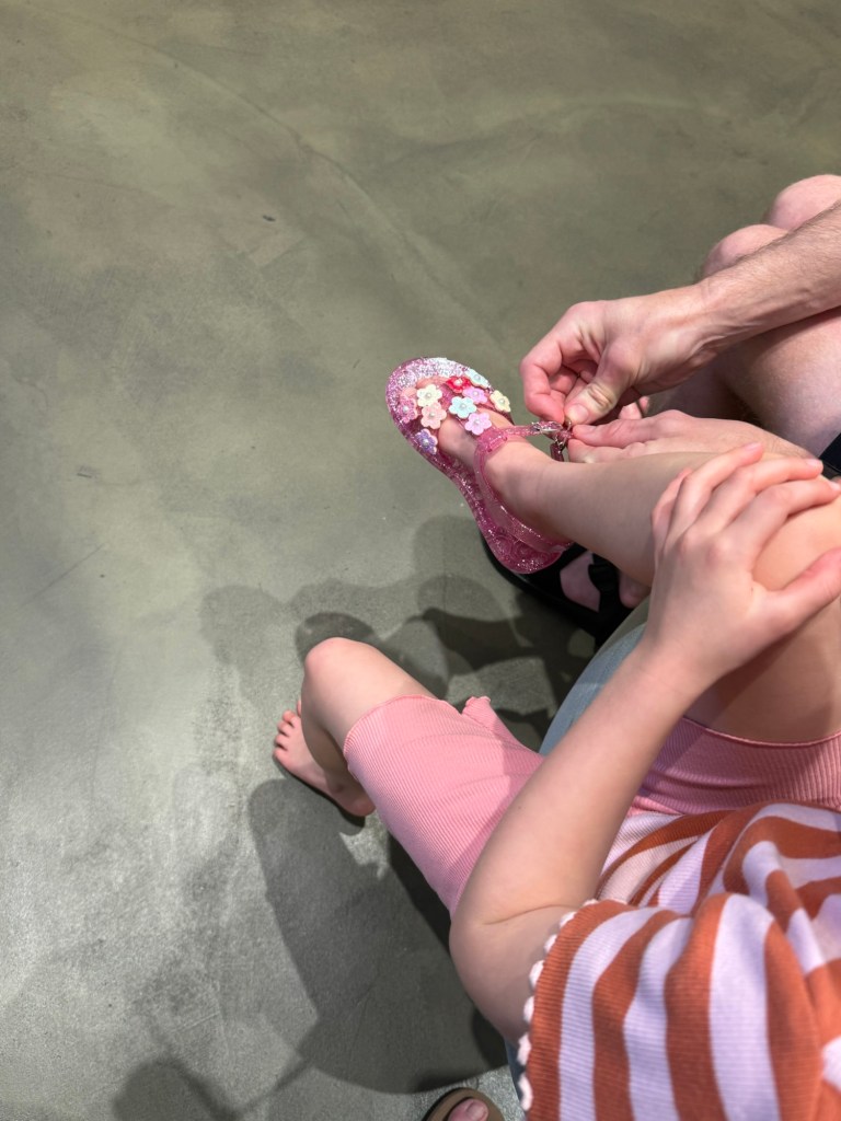On our way out, she spotted another pair of shoes in a different store. She immediately said “those. are. the. ones” They had her size. She wore them out of the store. And I think they are way cuter and more practical than glittery Elsa shoes. A happy ending all around!