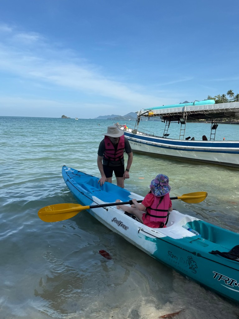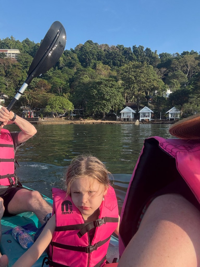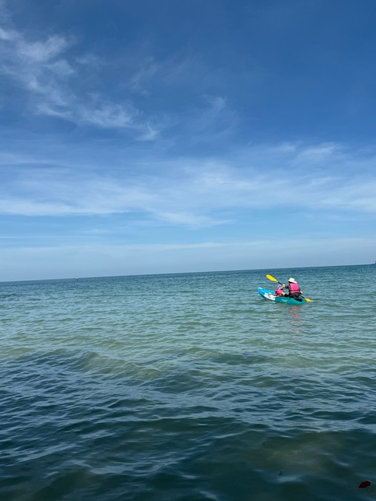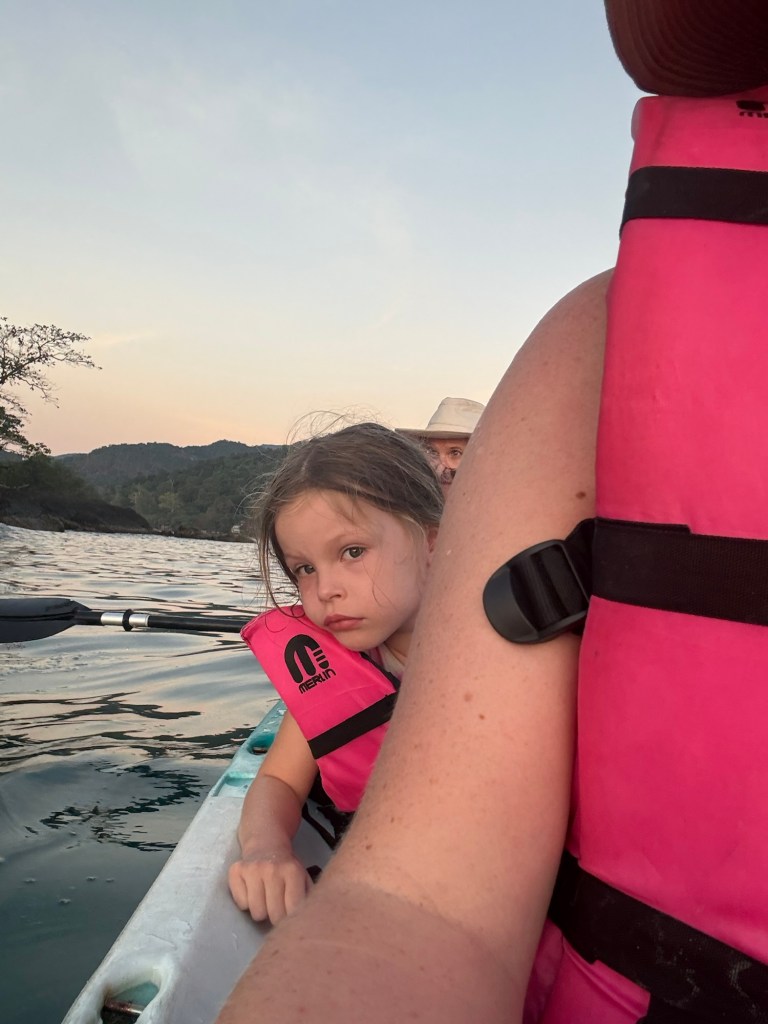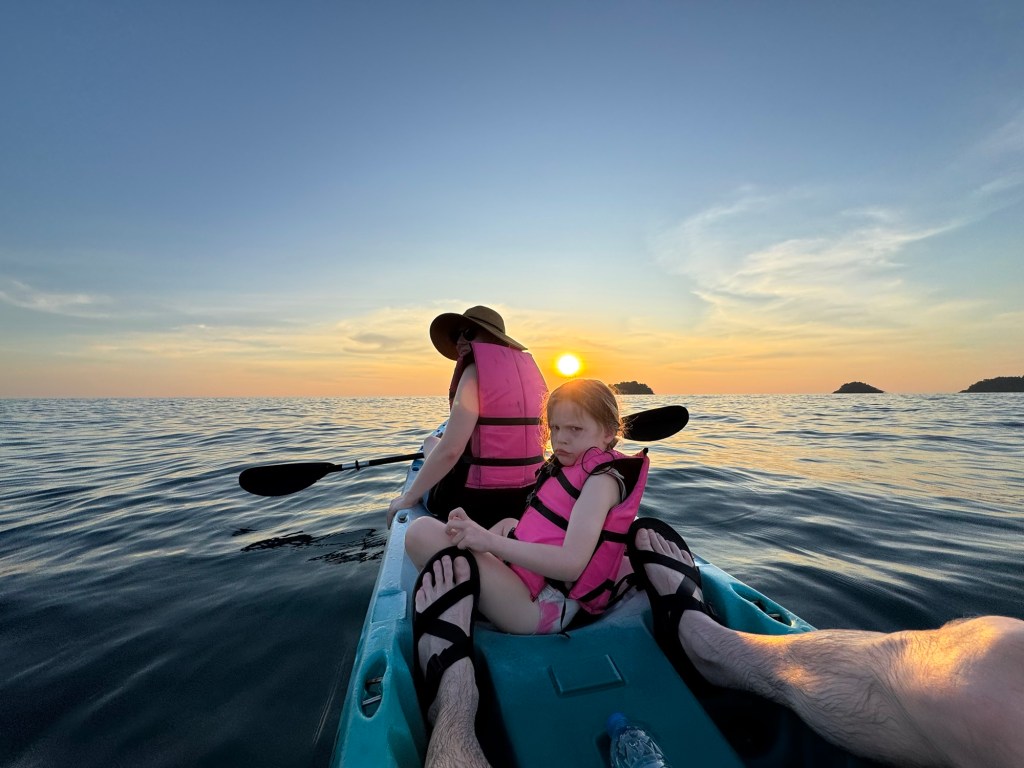 We swam in the pool, went back to the beach, and so on. I took her back to the hotel to get out of the sun for about an hour at 2PM. When we went back to meet Nick on the beach, we convinced her to go on a family kayak ride so that we could watch the sun set over the water. She reluctantly agreed.