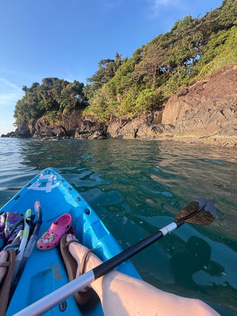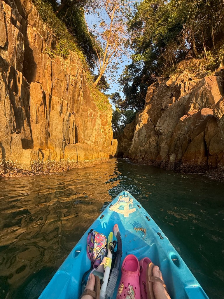 We got back in and started kayaking around the island. Nick wanted to find a nice spot to get out and watch the sunset. I was nervous about getting out on the rocky area because the waves were stronger and there were sharp mussels everywhere. Millie just wanted to go back to the hotel. We still had 20 minutes until sunset. So even though these photos look idyllic, in the background there was some light anxiety, heavy whining, and a short lecture on doing things you don’t want to do for the sake of other people.