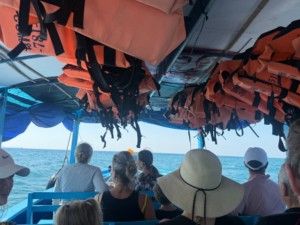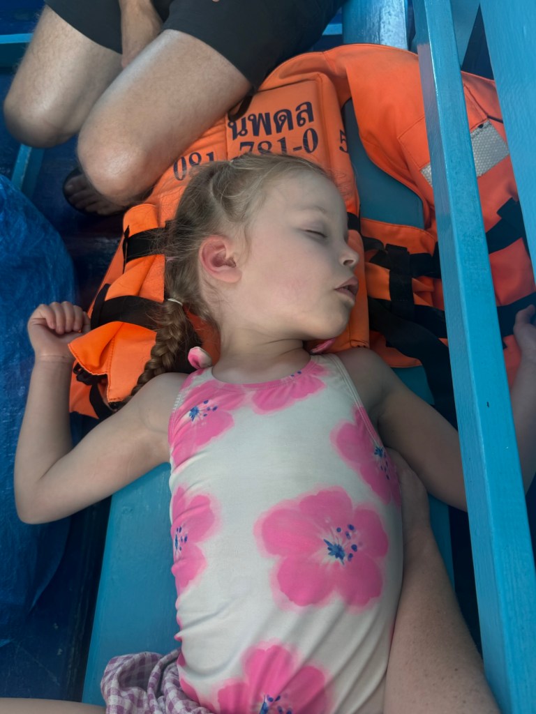 I better finish this up quick before the police arrive after my last paragraph and photo. It was very windy this morning and the waves were intense as we were getting on the boat and to our first stop. There’s no way I could capture it with a photo, but imagine big sways on the boat. Luckily I had dosed both Millie and I with Dramamine and we did fine. It made her sleepy and she passed out for most of the ride there.