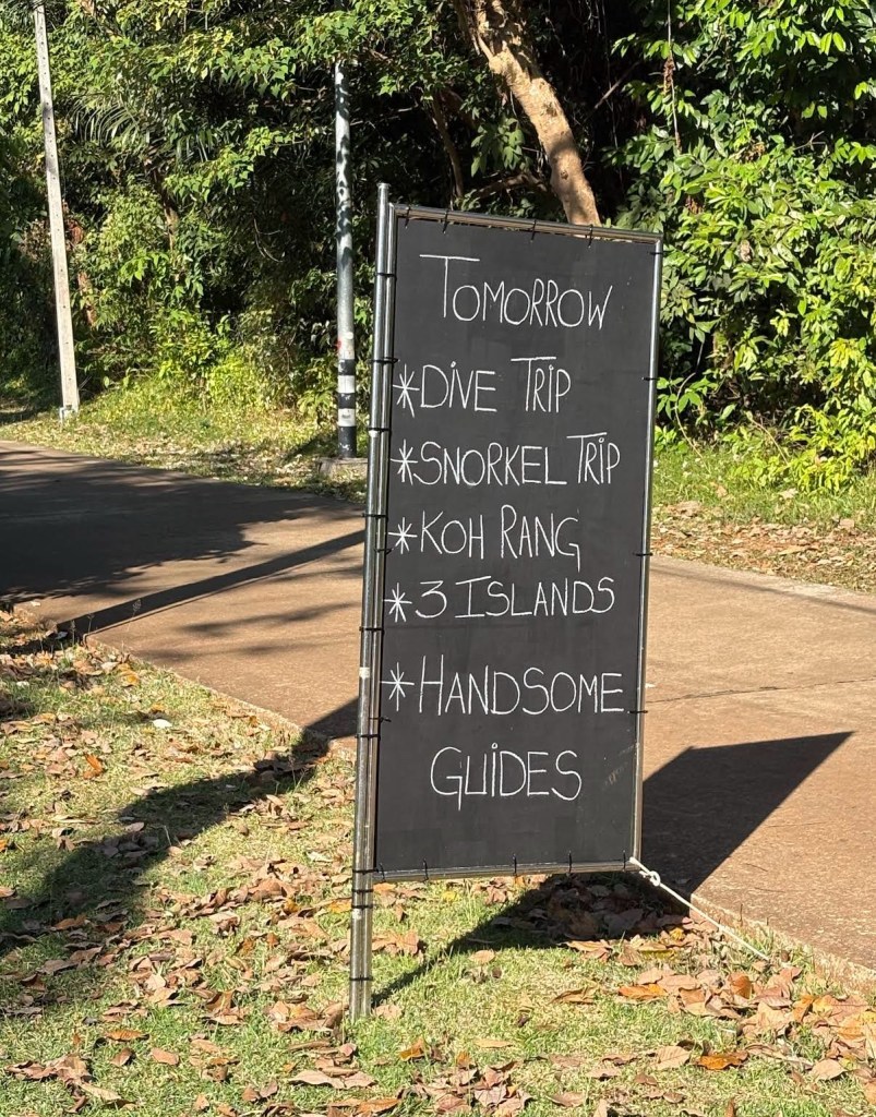 The dive shop had this funny sign outside promising handsome guides. It made me chuckle but then when we got on the boat I realized they weren’t kidding. Our guide was half British, half Dutch, full hunk. Here is a photo I pretended to take of Millie while thinking “I gotta get a picture of this guy”.