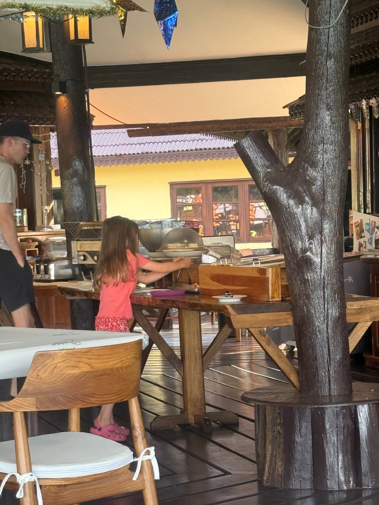 We woke up and had our classic hotel buffet breakfast. We have settled into a breakfast choreography now. First, Millie scans the buffet line to see if there is anything specific she wants, which there never is. Then she goes and chooses a table. While she does this, I prepare her a plate of food. It is always a bowl of cereal with milk or yogurt, fruit, and a small serving of scrambled eggs. While I’m making her plate, Nick gets coffee for the both of us and brings it to the table. Then while Millie is taking her first bites and our coffee is waiting for us, we prepare our plates. I always go for savory and high protein (eggs, whatever stir fry they have, noodles) and Nick gets a high fiber bowl of cereal. Once we’ve all finished this we go for our second plate and second coffee. Nick gets eggs and toast, I get fruit, and Millie gets whatever “treat” she wants, usually a pancake or toast with jam.