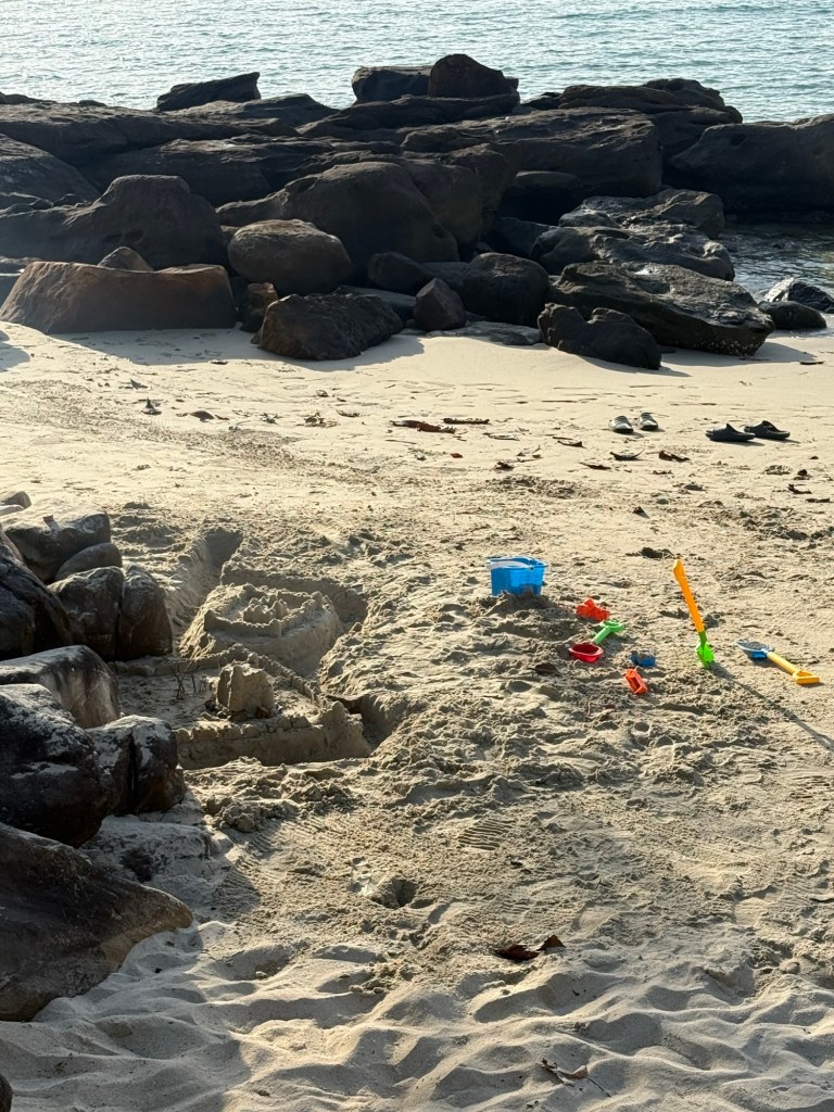 After breakfast we went down to the beach and remained there all day. Millie was able to play with her sand toys again without the risk of jellyfish or sandflies. She and Nick worked on a sandcastle while I texted with friends and started a new book. It was the only English fiction on the “leave it behind” shelf and is terrible so far.