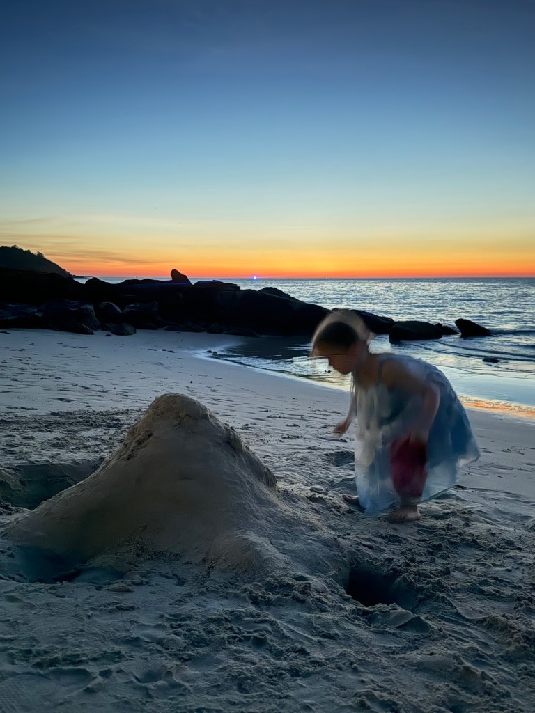Millie was very hungry and therefore very impatient, so the two of us walked down to the beach to pass the time while waiting for our food. She gave me a tour of the sandcastle she had built with Nick earlier in the day. Then we walked back up to the table right as our food was arriving.
