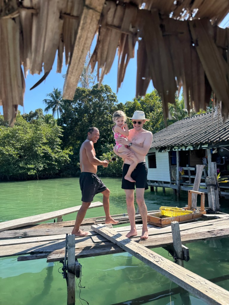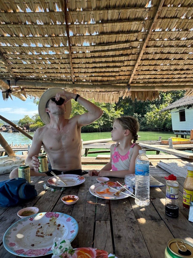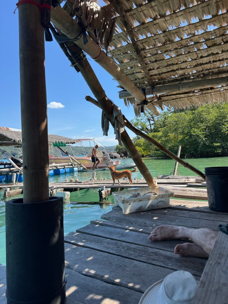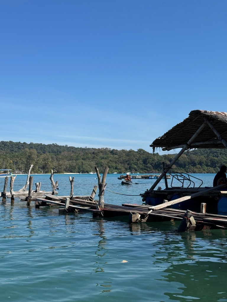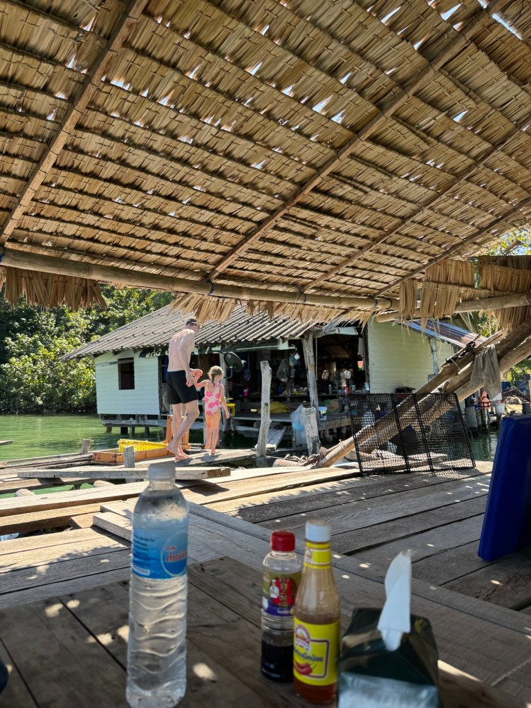 We kayaked around the curve of the island and pulled up to the restaurant, which was a series of floating platforms connected by old wooden planks.