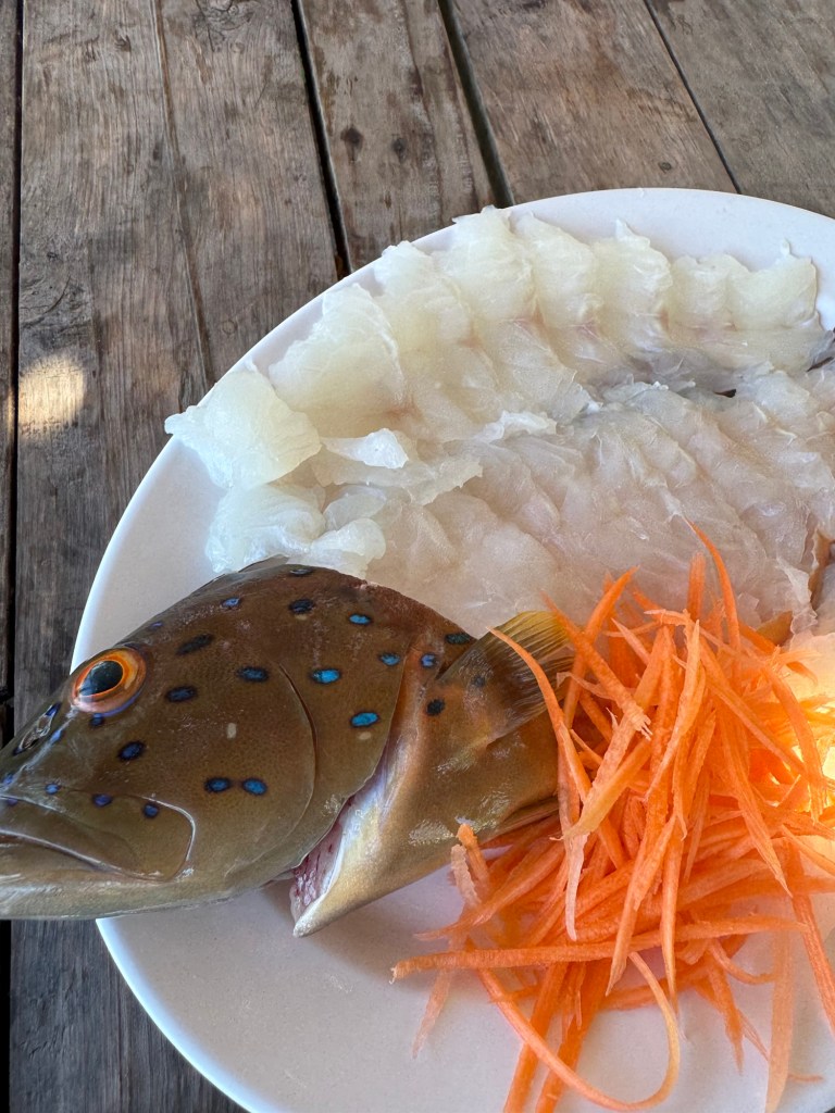We sat and watched as one of the owners got into his kayak and headed out to catch our grouper. He brought it back in a net, and 5 minutes later it was on our table.