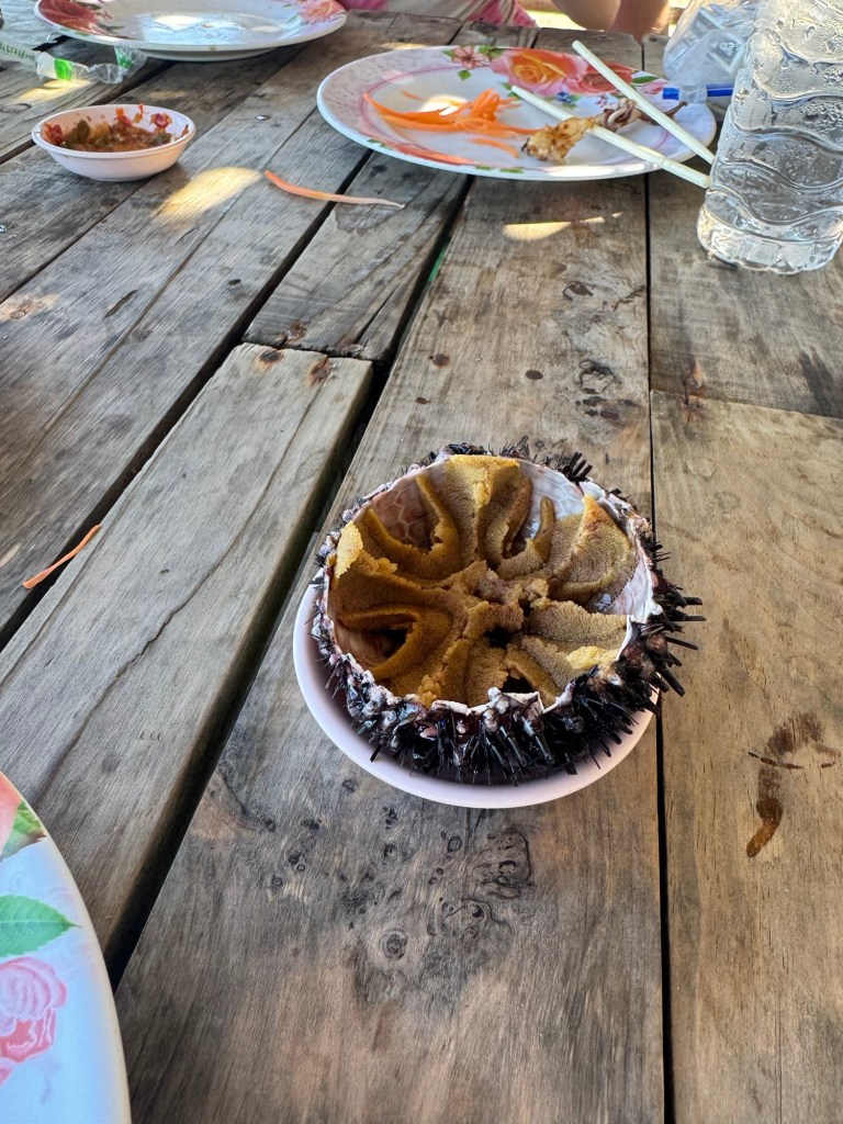 Our waiter cut off the spines and cut it in half to reveal the sweet orange meat. The remaining spines were still moving when it arrived at our table.