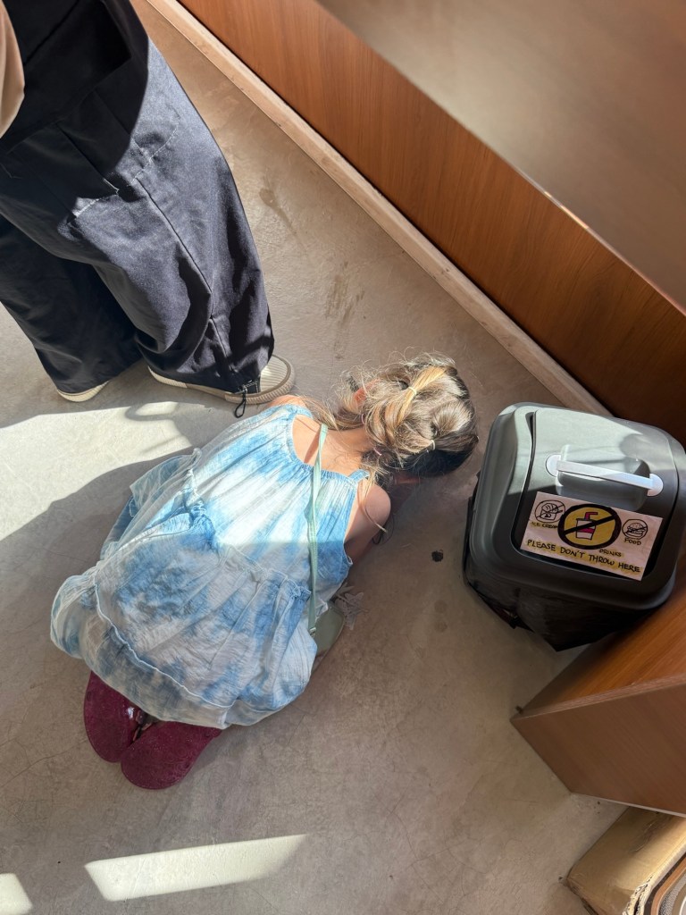 Millie played for about 5 minutes and then climbed on some equipment and suddenly started screaming—and I mean SCREAMING—for me. She either got stung by a bee or stung by some unknown insect. I picked her up and we examined below the scene of the crime but couldn’t find any culprits. She had a small bump on her hand and it got very red around the area, but no major side effects. It took a while to console her and I called Nick to let him know we were heading back too. Luckily he was just getting in a car and was able to come and get us.