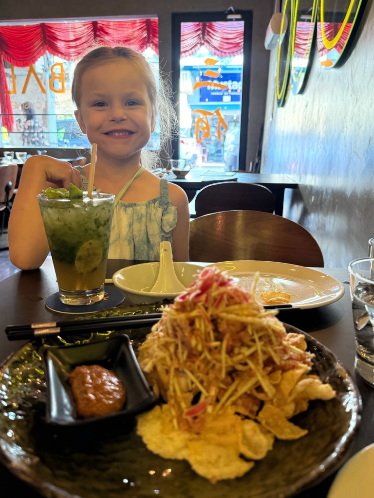 I am used to ordering for three, so it was hard to adjust to order for the two of us. Especially because they didn’t really have any kid-friendly food. I got Millie a special celebratory mocktail. I ordered bao, a mango salad, and a rice bowl. Millie ate almost nothing but I enjoyed the food so much that I ordered everything again to bring back for Nick.
