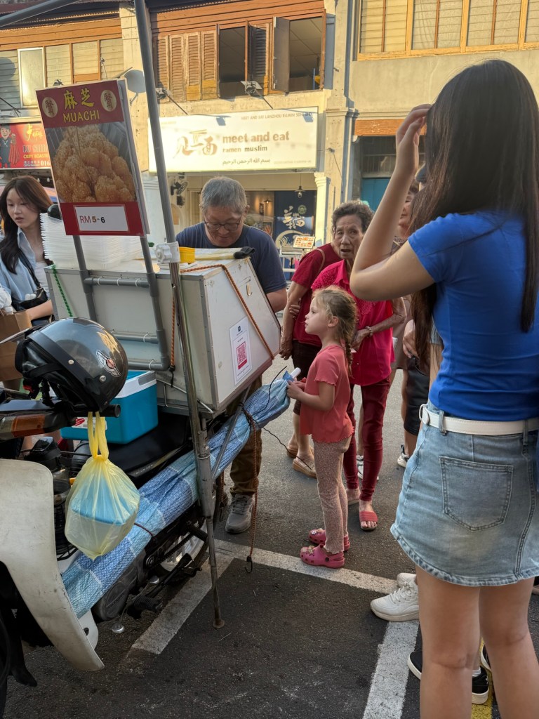 She decided on some glutinous rice cakes covered in crushed peanuts and sugar. The old lady in this photo grabbed her and insisted she cut the long line. She paid and proudly brought them back to our table.