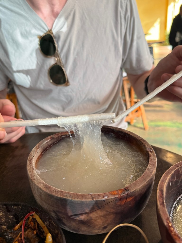 One was a thick paste made out of sago flour. Sago flour is made from the trunk of a sago palm. The texture was like something you’d accidentally sneeze onto your hand at the tail end of a bad cold. It tasted slightly sour. It was served with fermented durian soup on the side. Perhaps the least appetizing description ever? And the serving size was so big.