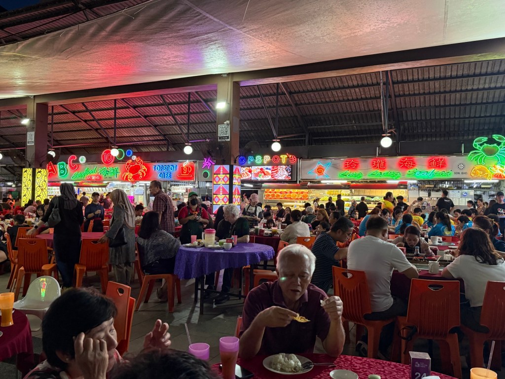 This was a large food court with many large tables. We sat down and ordered our drinks. The food menu was extensive. We chose what fish we wanted, and how we wanted it cooked. We over-ordered as usual, because we wanted to try lots of things. We got a large oyster cracker, Jellyfish, midin (a green fern that grows in the rainforest), rice, and a fried fish, Thai-style. It was all delicious.