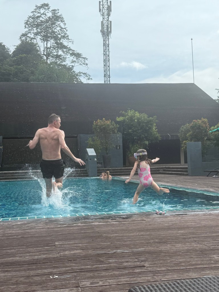 Nick took Millie to the pool while I had some quiet time. I went to meet them and read my book while watching them play in the water. Today’s new swimming trick is diving down to get things from the deep end.
