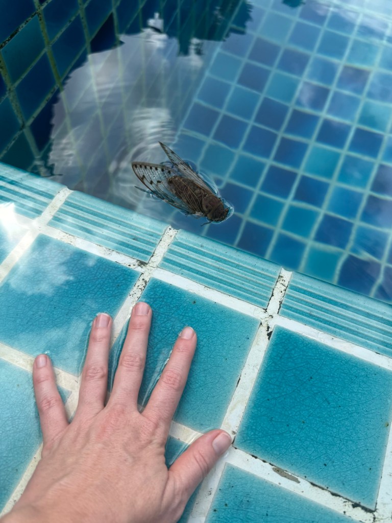 We rescued a ginormous cicada (I think?) that was in the pool. It was one of many huge insects we saw today. This post will be full of me attempting, and failing, to show the scale of huge things.