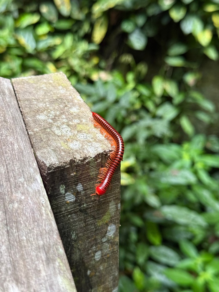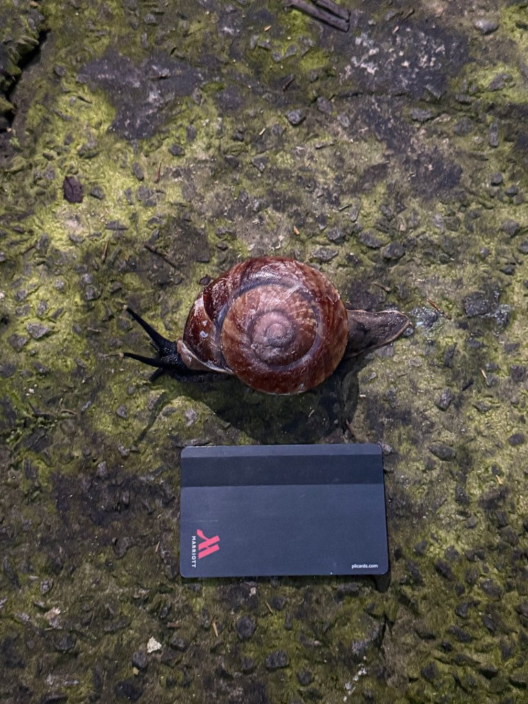 We started the long walk back to the visitors center. As the sun set the jungle started to get louder. There was a frog that sounded like it was yelling “what?!”. We saw more giant insects. A centipede and a snail (hotel room key for scale).