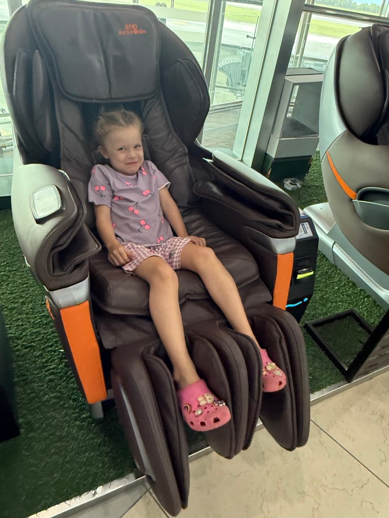 Millie and I did the rounds. She got gum for good behavior. We smelled every perfume in duty free. We spent 10 minutes side by side in massage chairs while she laughed hysterically and yelled “it’s punching my butt!!!” for 9 of those minutes.