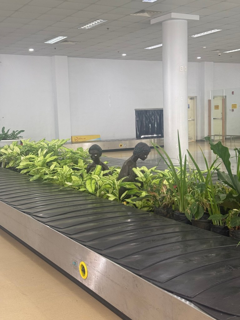 Our flight was delayed by over an hour while they changed the tire, but then we were on our way. We landed at the small Puerto Princesa airport. Millie was on the edge of a meltdown, due to residual sickness and tiredness. Away one point she grabbed me in terror and started yelling “what are those people over there?!” I didn’t know what to expect when I looked over and was greeted with the most terrifying airport art(?) ever. I can see why she jumped.