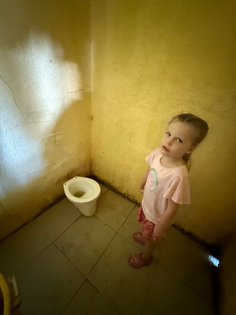 We used an awful toilet that I had to document. Preschool-sized bowl, no flush, no seat, no TP, no lock.