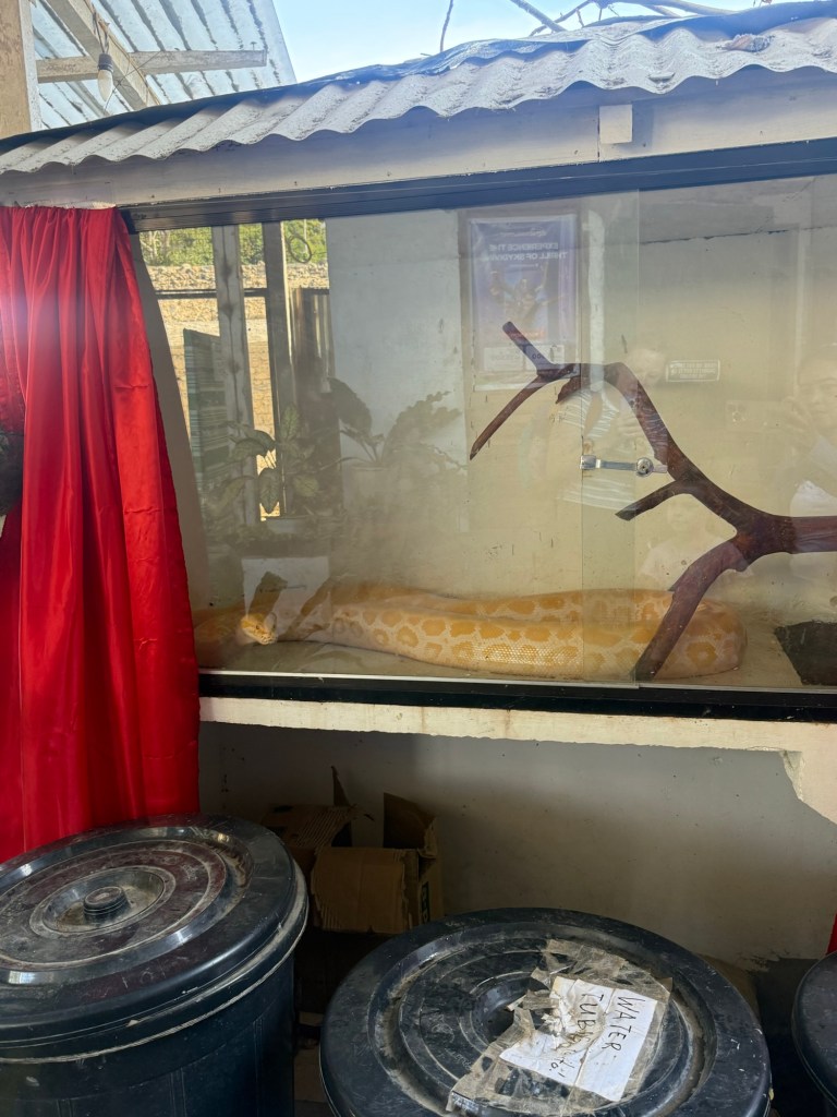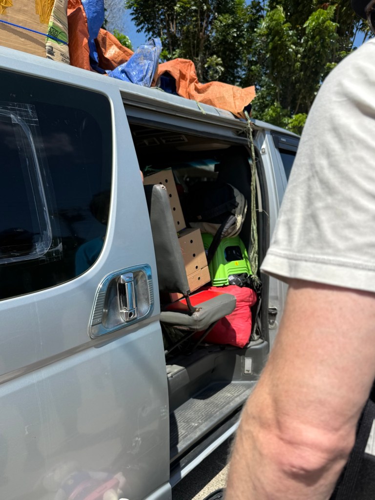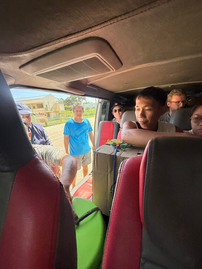 They offered us three seats. One was in the back and required you hold luggage on your lap, and two were in the front: passenger seat and middle jump seat next to the driver. Nick took the backseat, I took the jump seat, and Millie got the only seat with a seatbelt. We had a brief moment of debating getting out and trying to find a private ride, but the sunk cost was too high. We were in the middle of nowhere and a man just spent 30 minutes tying our luggage to the roof.