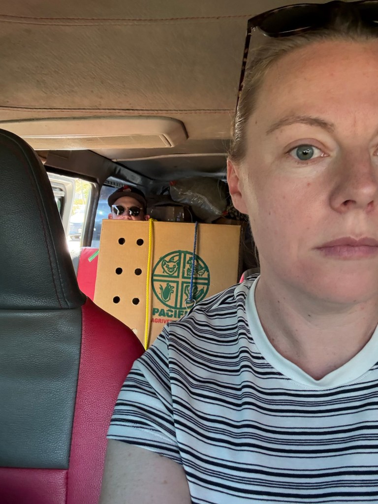 Eventually, the bus dispatcher guy came over and said “your bus is here, but there is a problem. It has cargo.” We were confused and figured that maybe the other tourists had more luggage than they had expected to carry, but no. It was truly cargo. Live chickens, two massive coolers of fresh fish, pineapples stuffed in every crevice, and who knows what else. There was also another family with two kids, a German couple, two men, and us.
