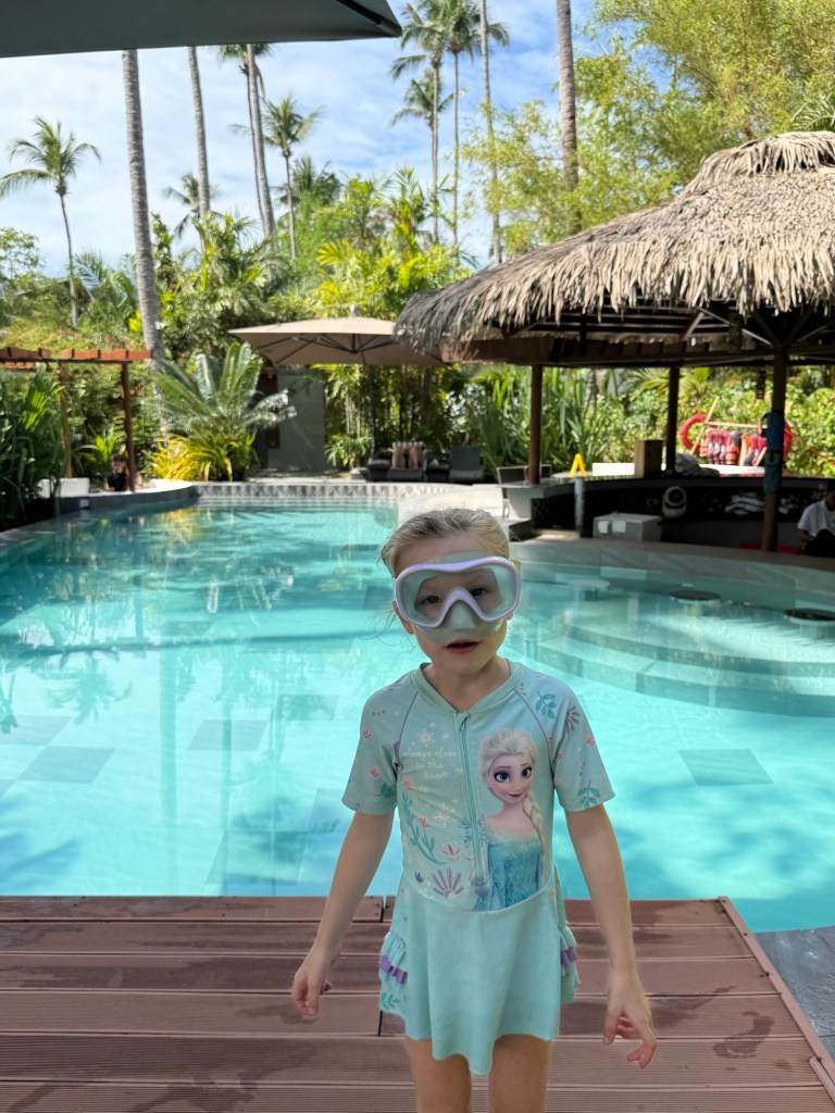After breakfast we eked out the last of our sunscreen and headed to the pool. We swam together and she spent a while playing with her playmobil people.